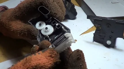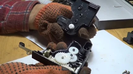 После того, как сделали прорези вдоль места крепления, крышку нужно с небольшим усилием расшатать и тогда она снимется. Вместе с крышкой снимется и моторчик привода, поскольку он закреплен на крышке в своем собственном корпусе. Под ней вы увидите механизм с пластиковыми шестернями.