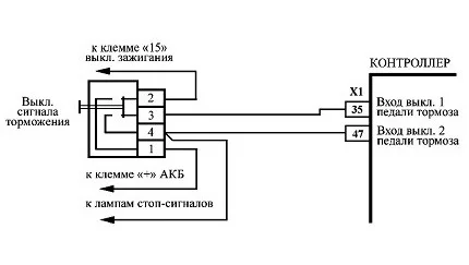 Выключатель сигнала торможения выполнен таким образом, что имеет две группы контактов. Обе группы посылают свой сигнал на контроллер. Одна группа контактов соединяет напряжение с Кл. 15, а другая с Кл. 30, которое поступает на питание ламп сигналов торможения.