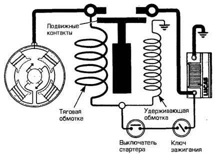 При этом шестерня, соединенная с бендиксом, выдавливается наружу до момента зацепления с венцом маховика. В результате зацепления замыкаются контакты встроенной схемы включения стартера. Далее втягивающая обмотка отключается, а сердечник остается в зафиксированном положении при помощи работающей удерживающей обмотки.