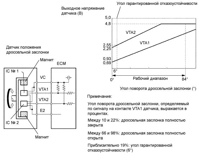 | 0-0,2 В, или 4,5-5,0 В | 2,4-3,4 В (в аварийном режиме) | 0-0,2 В, или 4,5-5,0 В | 2,4-3,4 В (в аварийном режиме) | Обрыв или короткое замыкание на массу в цепи VTA1 |