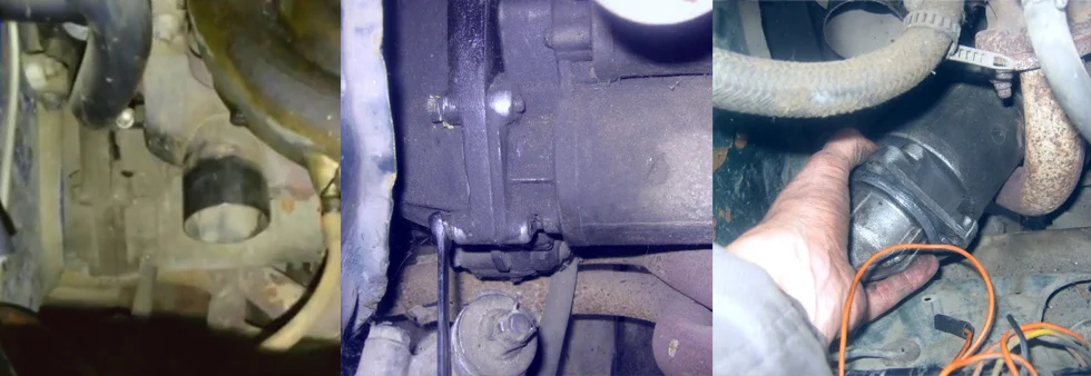 Два верхних болта крепления стартера ВАЗ 2104 и других жигулях можно увидеть вот на этой картинке, а к нижнему подбираемся из под автомобиля.
