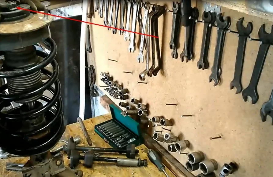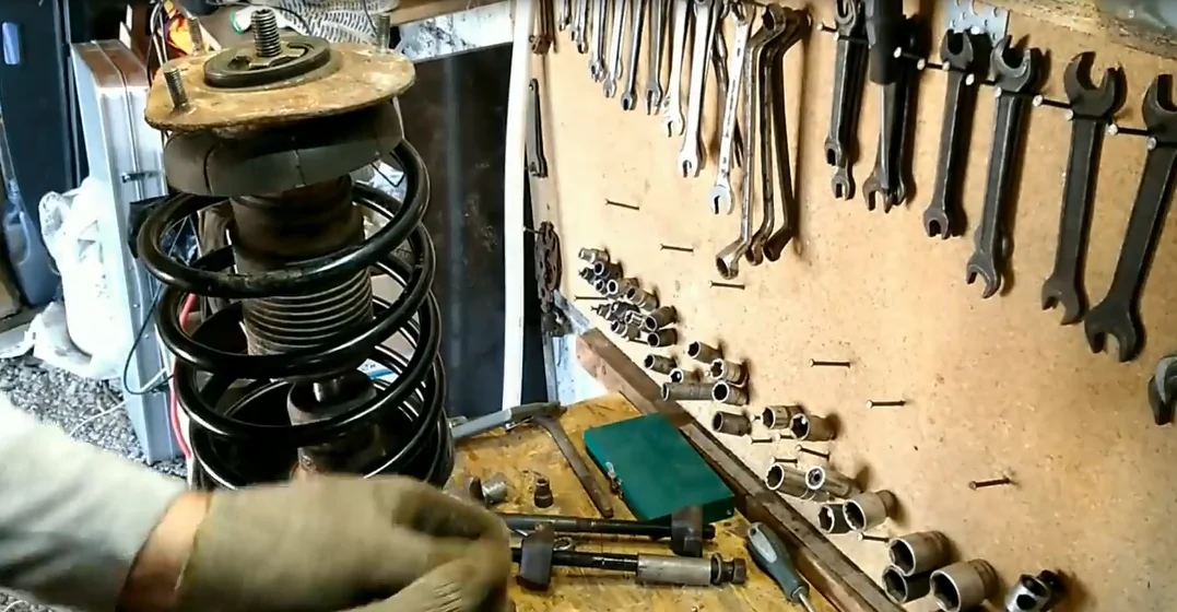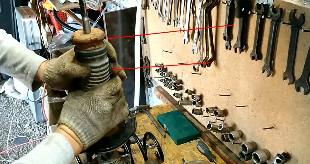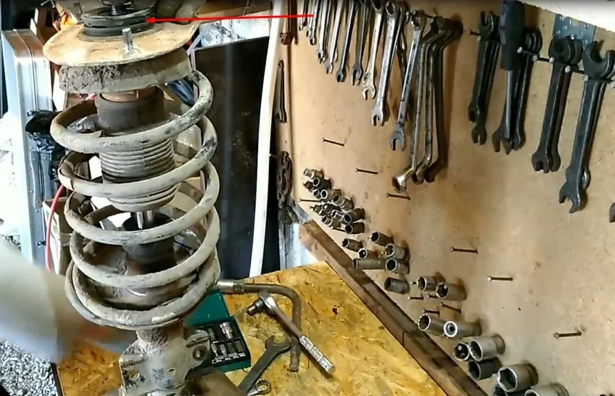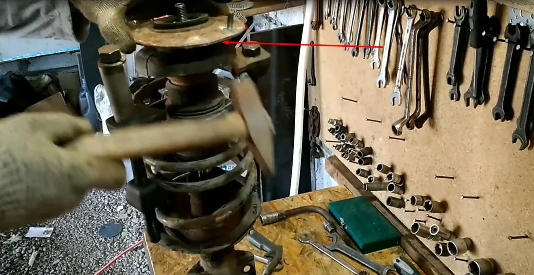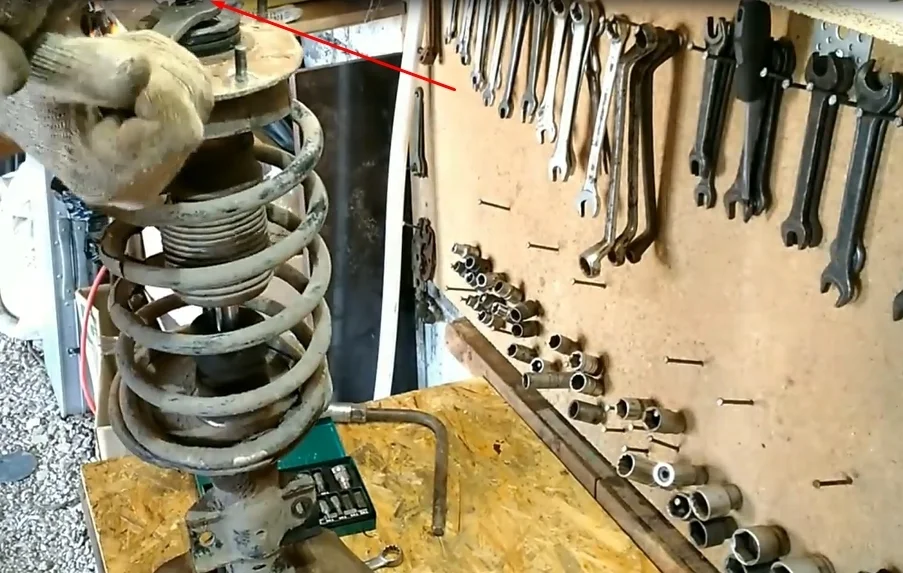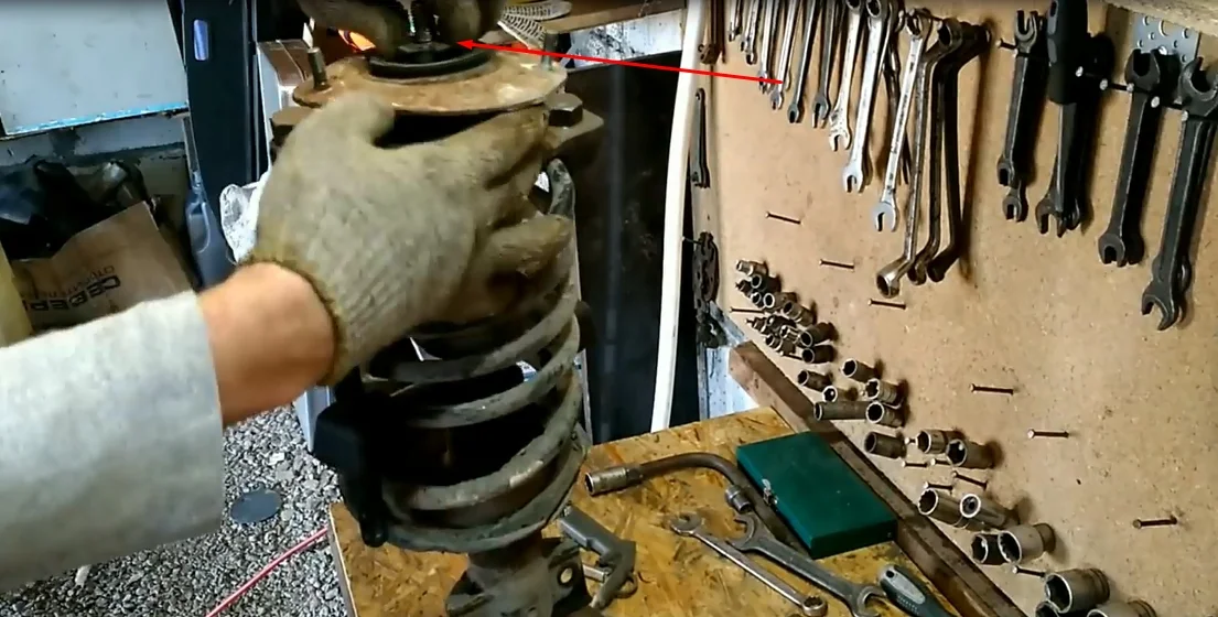 - Снимаем опору вместе с пружиной.