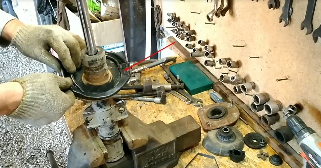 - Снимаем отбойник и пыльник стойки, а также прокладку под пружину.
