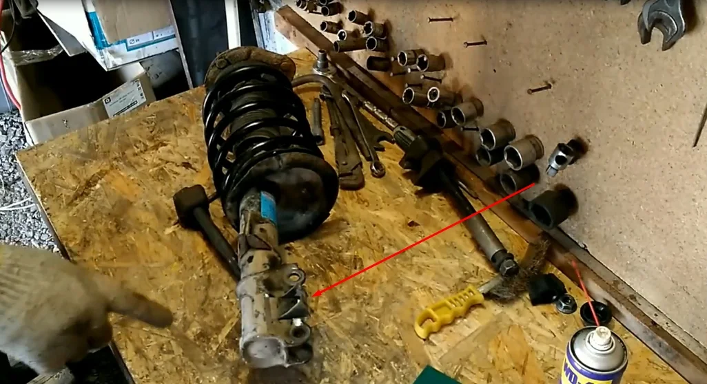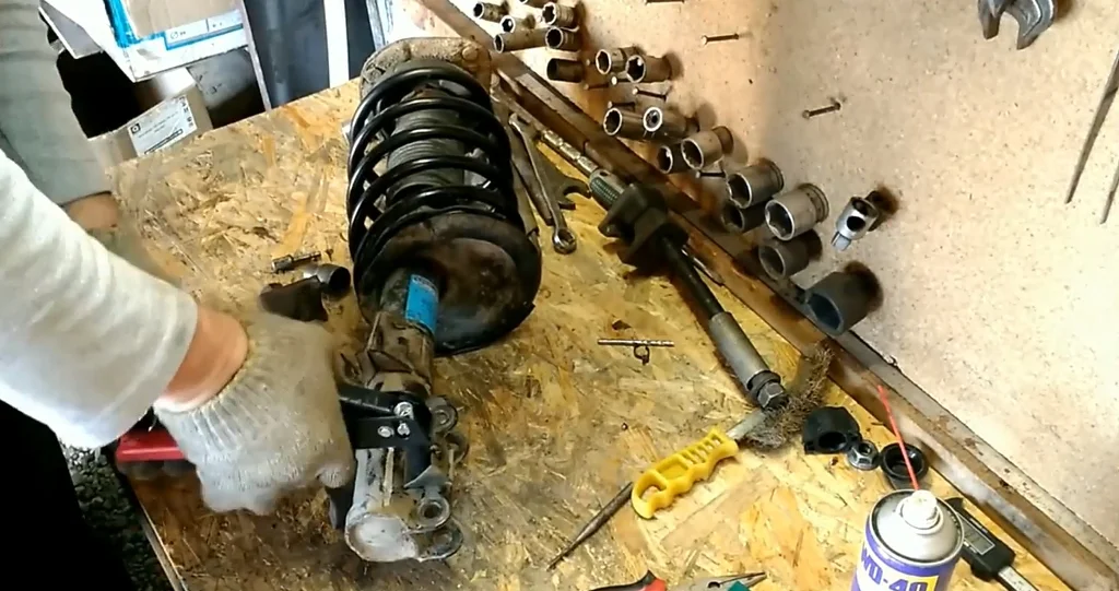 - Вынимаем стойку и зажимаем ее в тисках. После снятия стойки поворотный кулак лучше зафиксировать проволокой чтобы не выпал привод из ступицы.