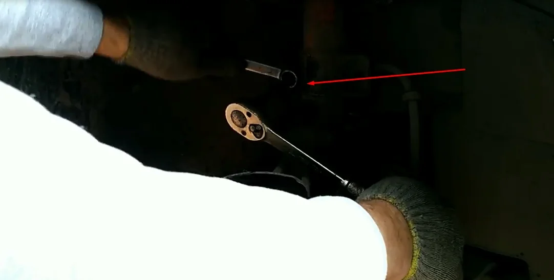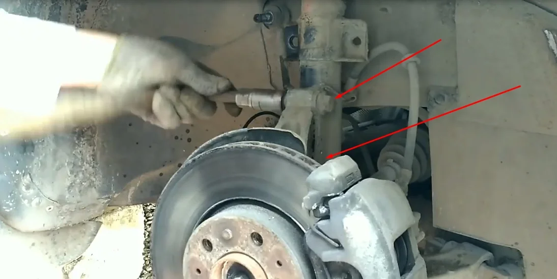 - Откручиваем и вынимаем два болта крепежа стойки к кулаку. Удерживаем головку болта накидным ключом, а воротком с головкой откручиваем гайку. Гайка и головка болта на семнадцать.