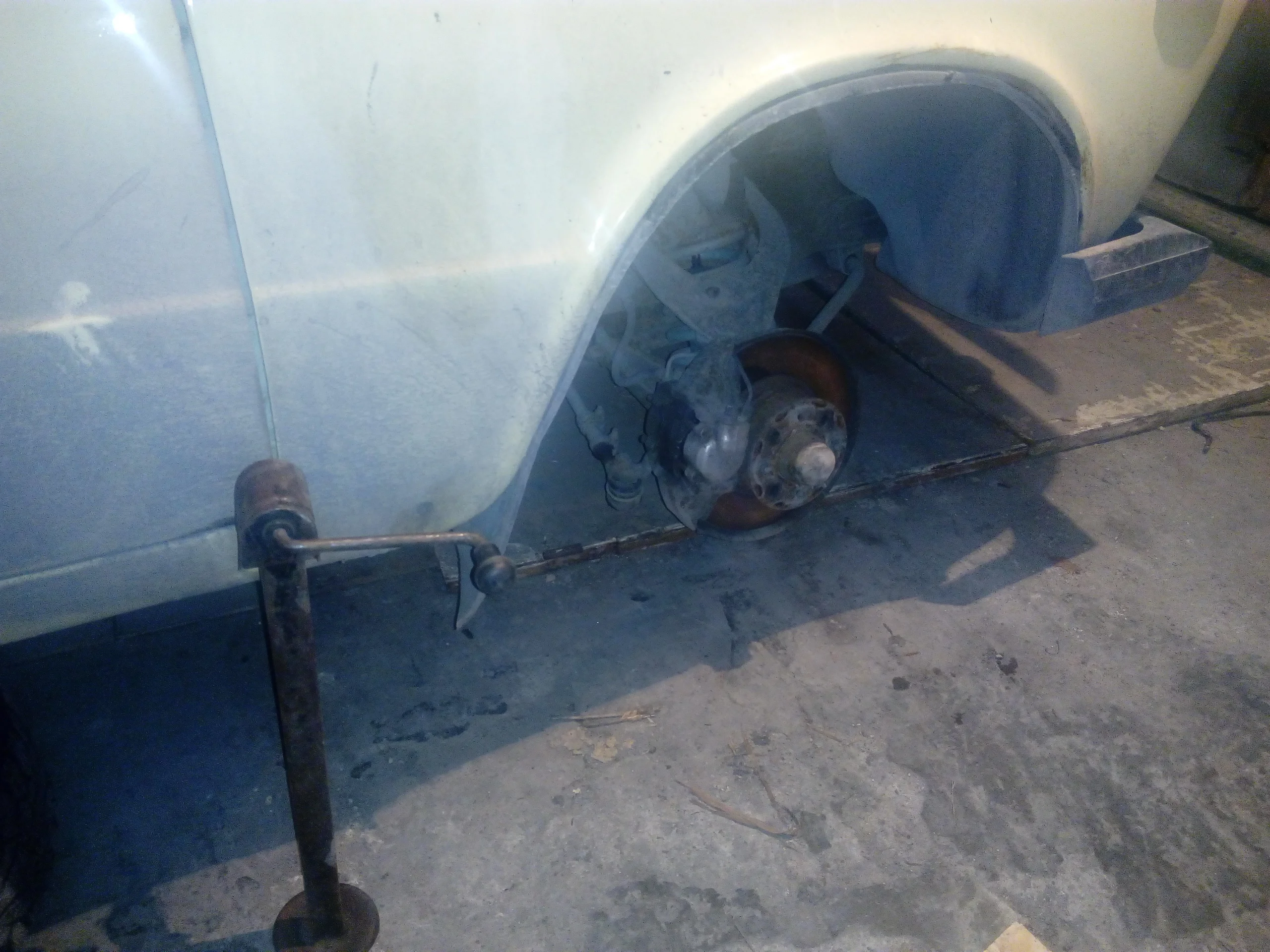 - Подкладываем бруски под правое заднее и левое переднее колесо