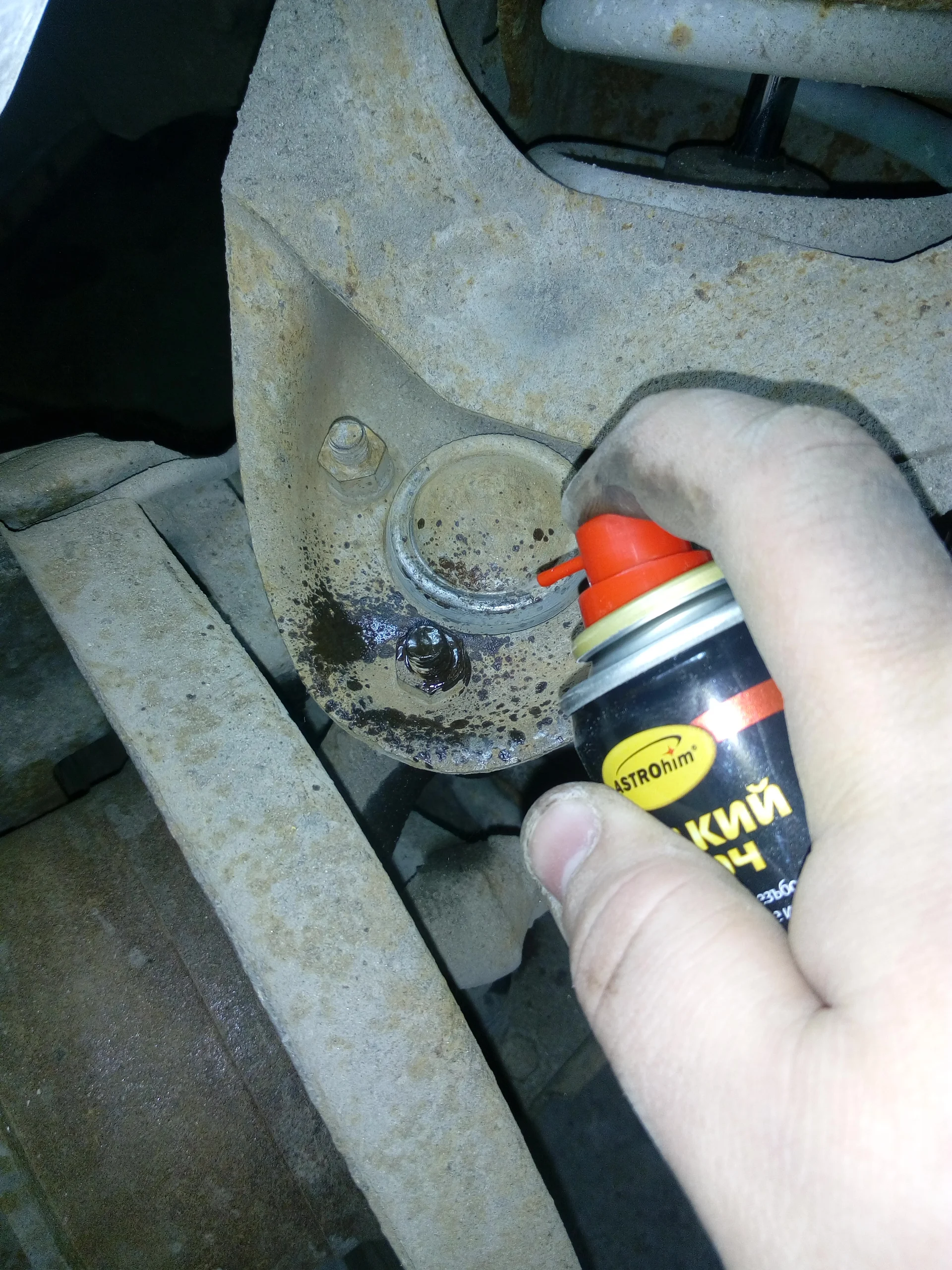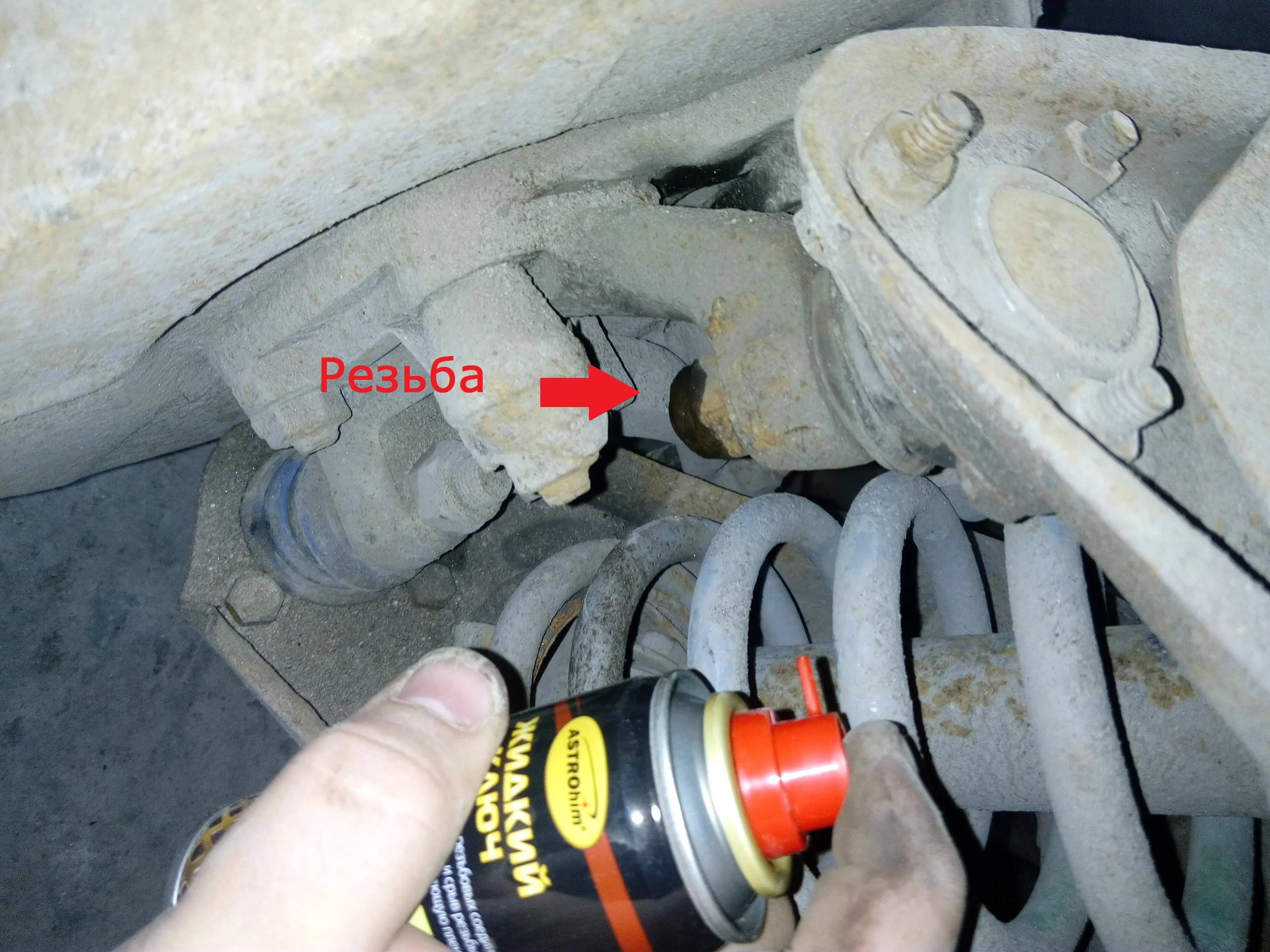 - Тщательно забрызгиваем проникающей смазкой обработанные местаСтарайтесь чтобы смазка не попала под пыльник. Так как начнет прокручиваться палец в самой шаровой. А нам это не нужно. Ждем 10-15 минут для проникания смазки.