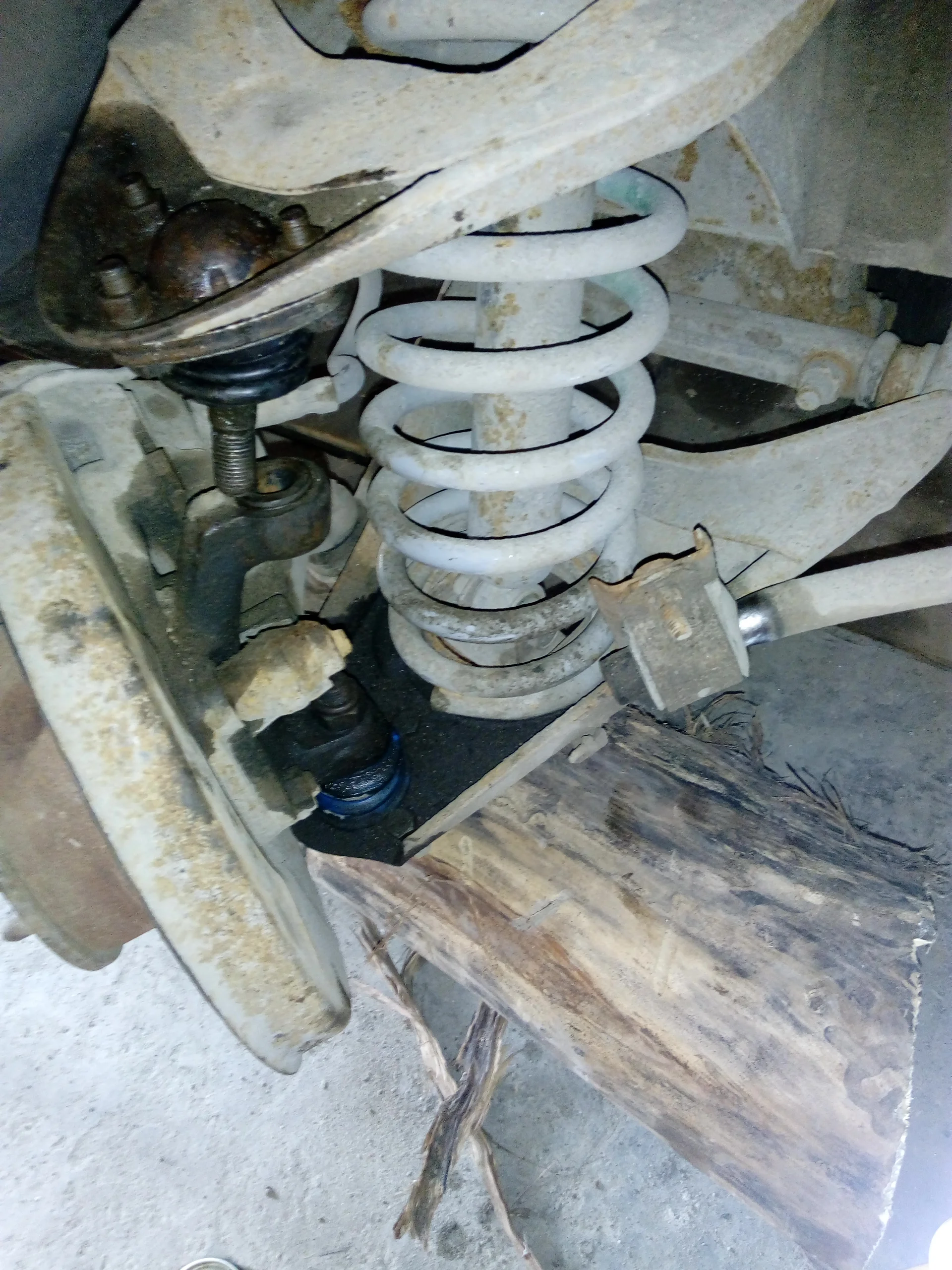 - Далее подкладываем подложку или бревно под нижний рычаг и опускаем домкрат, попадая пальцем шаровой в поворотный кулак.