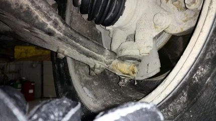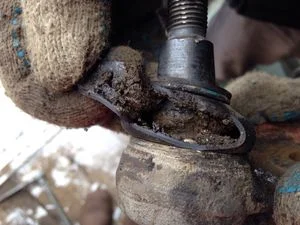 - Порванный пыльник. Эта часть шаровой опоры, грубо говоря, считается расходным материалом, поэтому автовладельцу желательно периодически следить за его состоянием, в частности, целостностью. Если пыльник повредиться, то внутрь шаровой опоры во время езды на автомобиле наверняка попадет влага, песок, грязь, мелкий мусор. Все эти элементы будут образовывать абразивный материал, который будет естественным образом изнашивать внутренности опоры. Поэтому порванные пыльники нужно своевременно менять используя при этом соответствующую смазку.