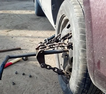 - Лебедка или талреп. Стянуть колесо можно грубой тягой. Для этого нужна стропа или цепь, лебедка или талреп и упоры. Машину нужно зафиксировать упорами, чтобы ее не тащило в сторону, затем продеть стропу или цепь через колесо, образуя петлю. За эту петлю нужно зацепиться лебедкой или цепью с талрепом, закрепив второй конец неподвижно, после чего тянуть в направлении от авто.