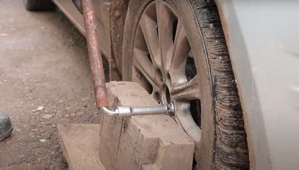 - Удары по колесу. Машину следует надежно зафиксировать на домкрате (желательно также подставить упор, пенек или хотя бы положить запаску на случай соскакивания авто), после чего несколько раз ударить ногой по шине в разных точках.
