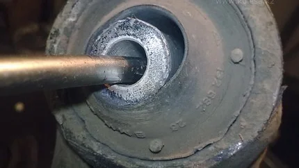 При наличии возможности немного опустить подрамник (например, на домкрат или упор) и освободить центральную втулку сайлентблока, можно проверить его металлическим прутком подходящего диаметра. Он вставляется в отверстие центральной втулки, после чего используется как рычаг для давления на резину в разных направлениях. Таким образом можно обнаружить труднозаметные в других условиях трещины, разрывы, отслоения резины от железа.