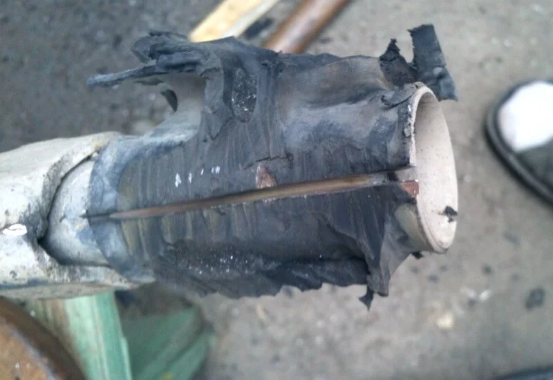 На внутренней части срезаем резину и легонько, дабы не повредить рычаг делаем пропил, а потом зубилом и молотком сбиваем.
