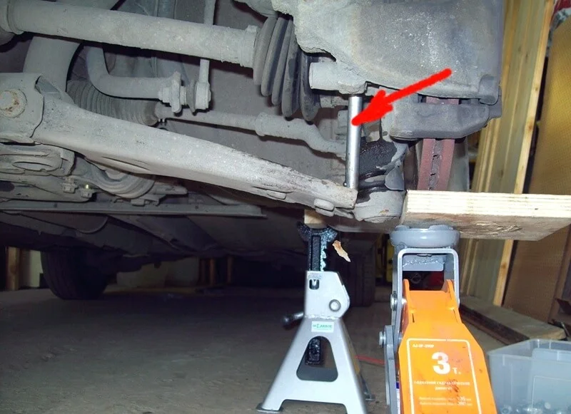 Если нет специального съемника, то чтобы проще вышла шаровая опора можно поджать домкратом и выбить её используя наставку.