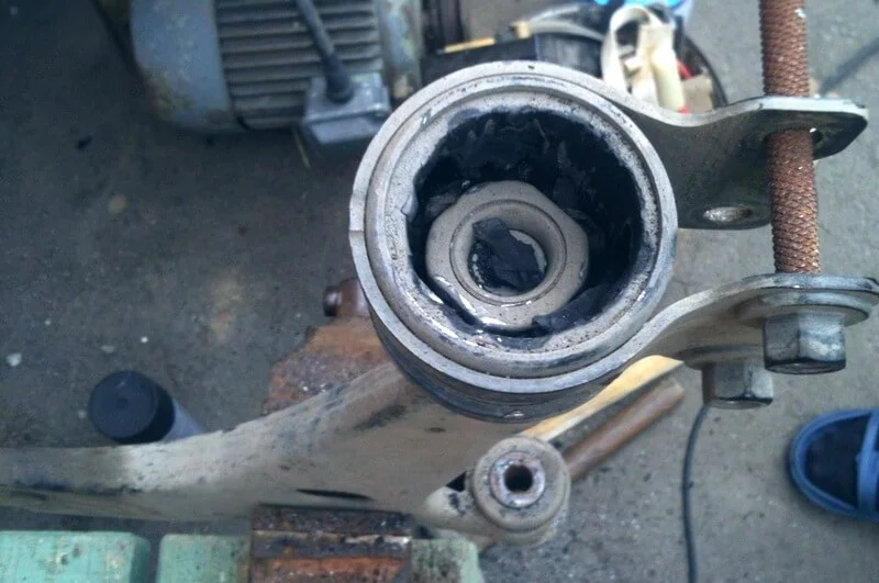 Вот видим дефекты заднего сайлентблока. Такие порывы могут быть источником шума на кочках, а на скорости вибрировать руль.