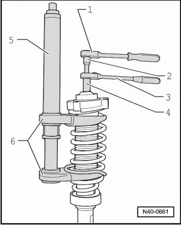- Предварительно сжать винтовую пружину с помощью устройства натяжения пружин -VAS 6046- и держателя пружины — VAS 6046/3-;
