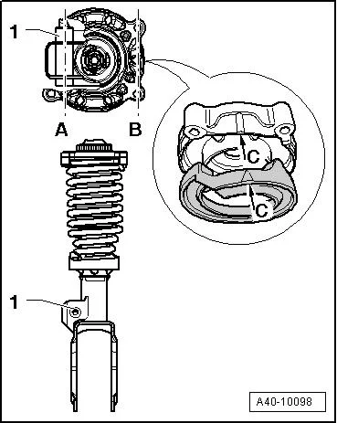 - Верхнюю чашку необходимо установить на пружину так, чтобы маркировка -стрелка C- находилась напротив крепления соединительной тяги -1-;
