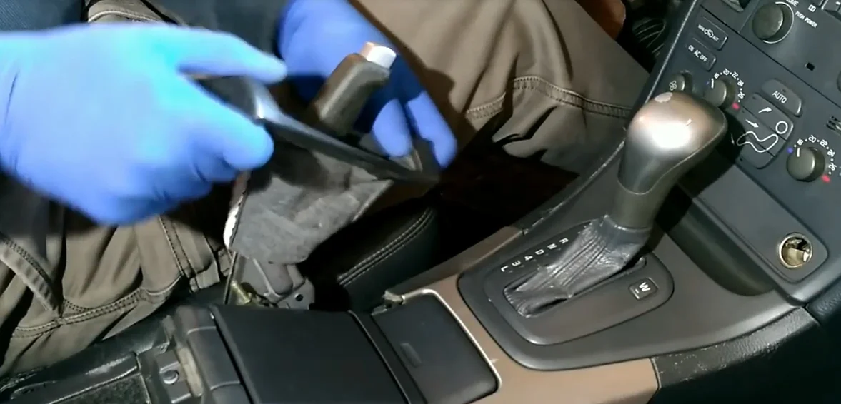 - С помощью пластиковой лопатки с правой стороны подковыриваем и отщелкиваем внешнюю декоративную пластмассу возле ручки АКПП.