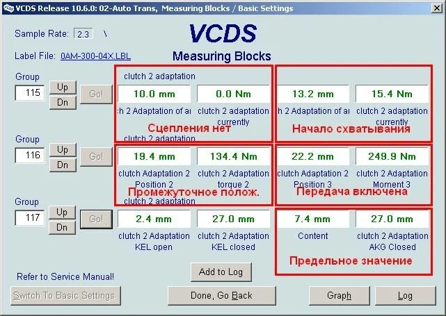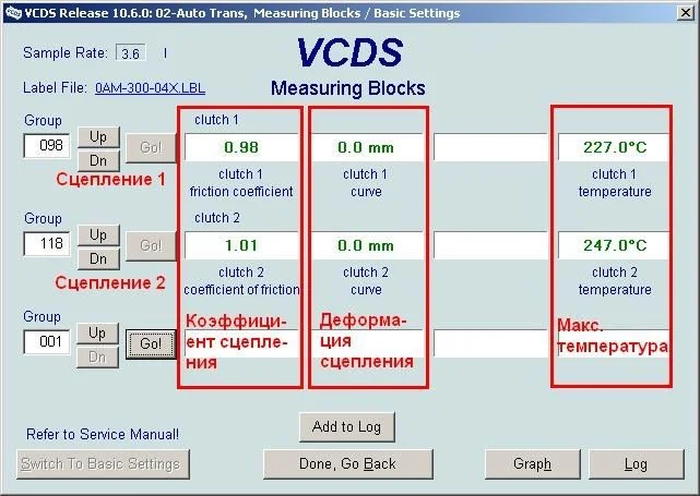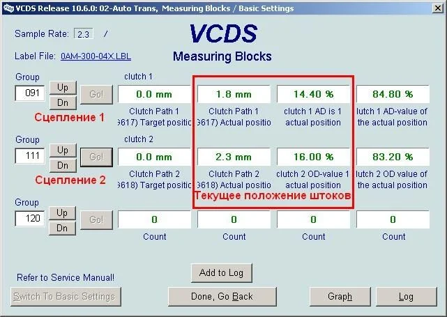 Желательно выполнить аналогичные процедуры в динамике, то есть, при движении машины по гладкой ровной дороге с максимальной передачей крутящего момента на коробку. Для этого нужно зайти в группы 91 и 111 для первого и второго диска соответственно. Ехать для диагностики можно в режиме D либо на четвертой, пятой или шестой передачах. Динамику необходимо замерять на четном и нечетном сцеплении. Желательно предварительно нажать кнопку Graph с тем, чтобы программа начертила соответствующие графики.