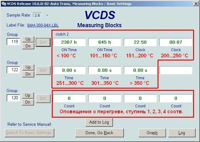 Далее необходимо перейти к температурным характеристикам. Для начала нужно посмотреть статические показатели. Для этого необходимо перейти в группы 99, 102 для первого диска и 119, 122 — для второго. Из показаний можно узнать, работало ли сцепление в критических режимах, и если да, то сколько именно часов. Также на экране можно посмотреть конкретные температурные значения. Чем при меньшей температуре работало сцепление — тем лучше, тем оно менее изношено.
