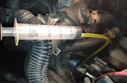 - Открываем штуцер и шприцем тянем жидкость из цилиндра, контролируя уровень в бачке.