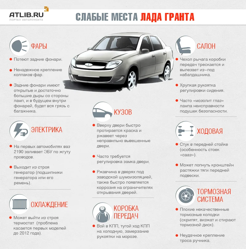 Очень много водителей отдали предпочтение этому бюджетному седану, привлекшему внимание своей доступной ценой. Наверняка с первых километров пробега у вас не возникнет проблем, но спустя около 1000 км появляться первые поломки. Изучив различные форумы, сайты с отзывами и автоблоги удалось выяснить слабые места и те трудности с которыми пришлось столкнуться владельцам Лада Гранта. Основную массу болезней гранты конструкторы уже исправили и врятли вы столкнетесь с ними купив эту модель после 2013 года, но все же они имеют место быть и могут приключится на б/у автомобилях первых партий.