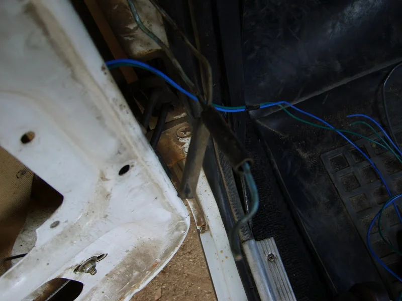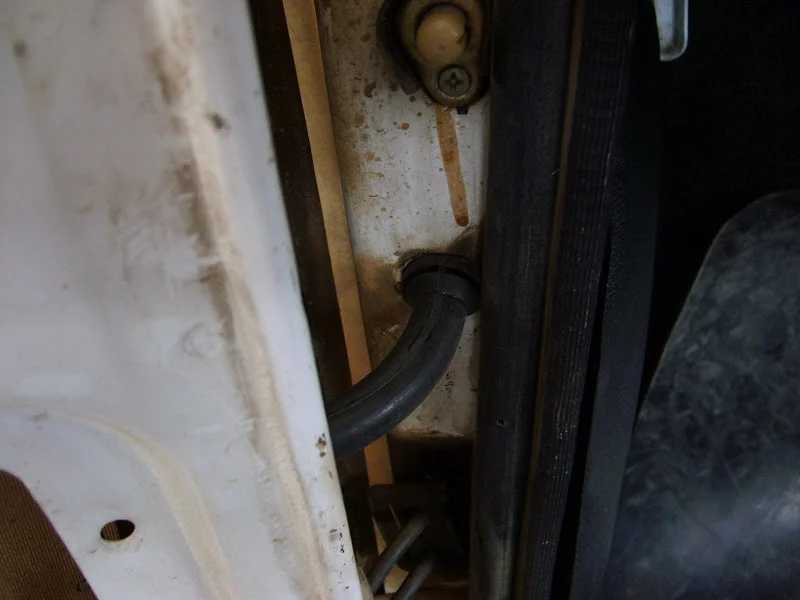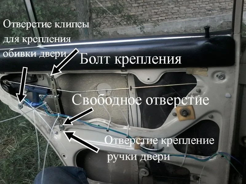 Протягиваем жгуты под обивкой пола вдоль передних дверей, заводим через центральные стойки где проходят провода к плафонам освещения салона и выводим наружу в районе верхнего окончания нижней пластиковой накладки (накладка перед этим снята). Привод центрального замка устанавливаем как на рисунке ниже.
