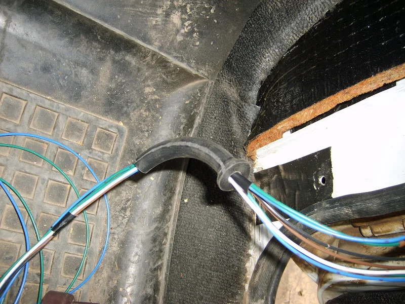 Всего получилось 7 проводов, они с большим трудом, но проходят. Теперь начинаем прокладывать провода сквозь отверстия, одной стороны их мы тянем под панель приборов, а с другой бардачок.