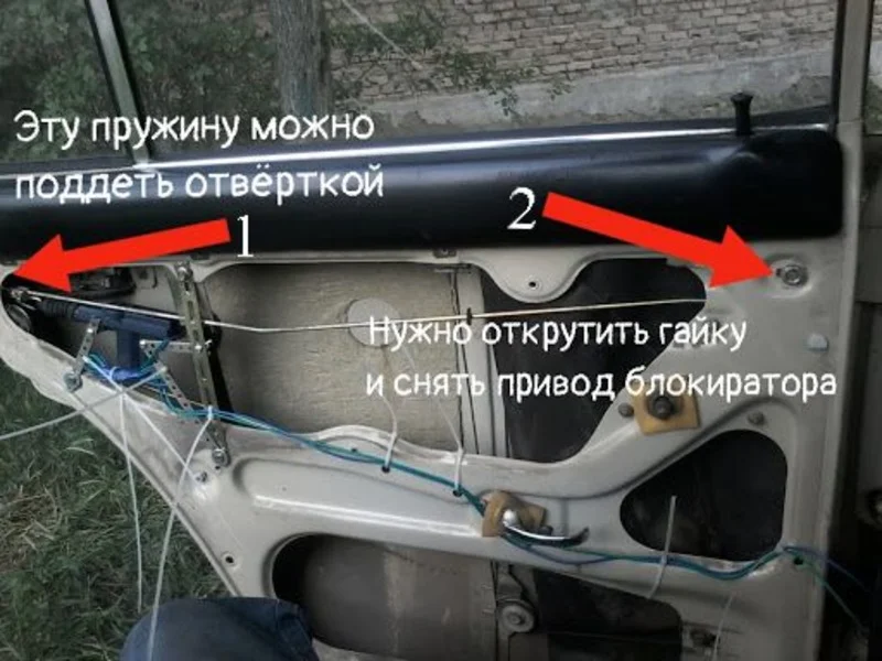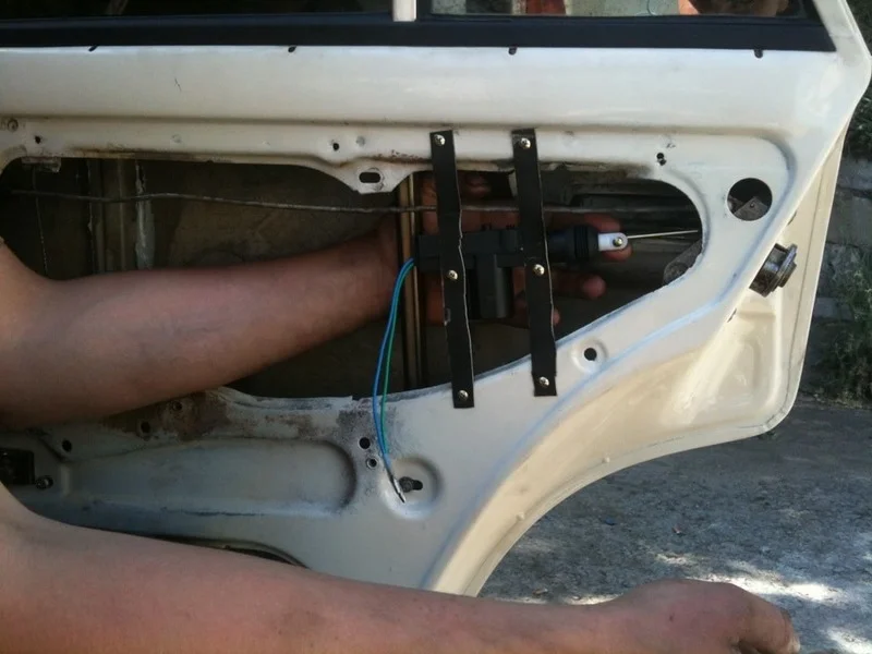 После установки приводов в задние двери, подключаем к ним провода, затем проверяем работу центрального замка. Зачастую с передними дверьми проблем не возникает, а с задними может не хватить мощности привода. Для этого нужно будет снять 2 пружинки. Ниже будет приведен наглядный пример, что делать если возникнет такая трудность.