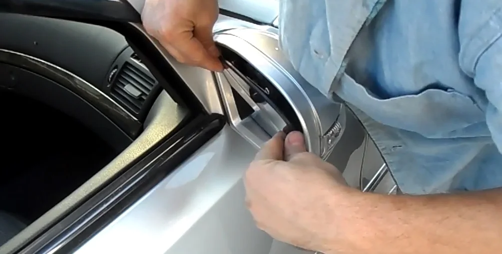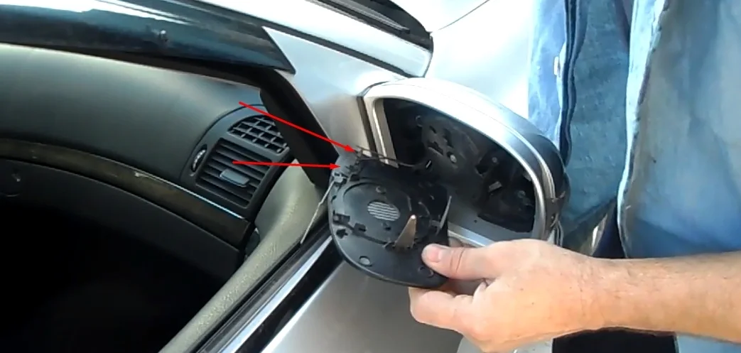 - Беремся руками за зеркальный элемент и стягиваем его на себя с нижних пластиковых защелок.
