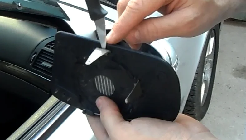 Демонтируем с оригинального зеркального элемента пластиковые защелки.