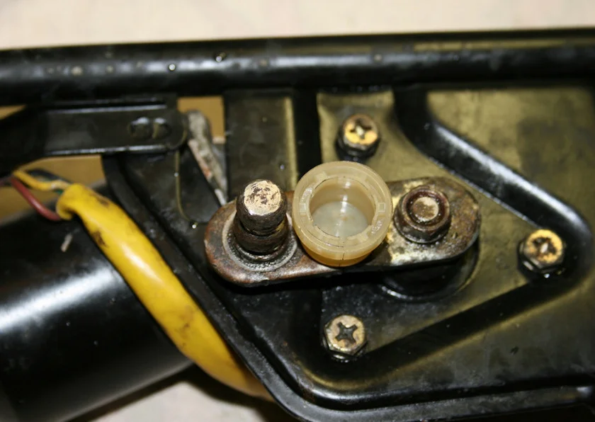 Снимаем трапецию, чтобы было удобнее менять втулки. Откручиваем 3 болта трапеции, первый болт посередине, а второй возле моторчика.