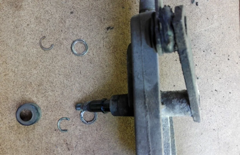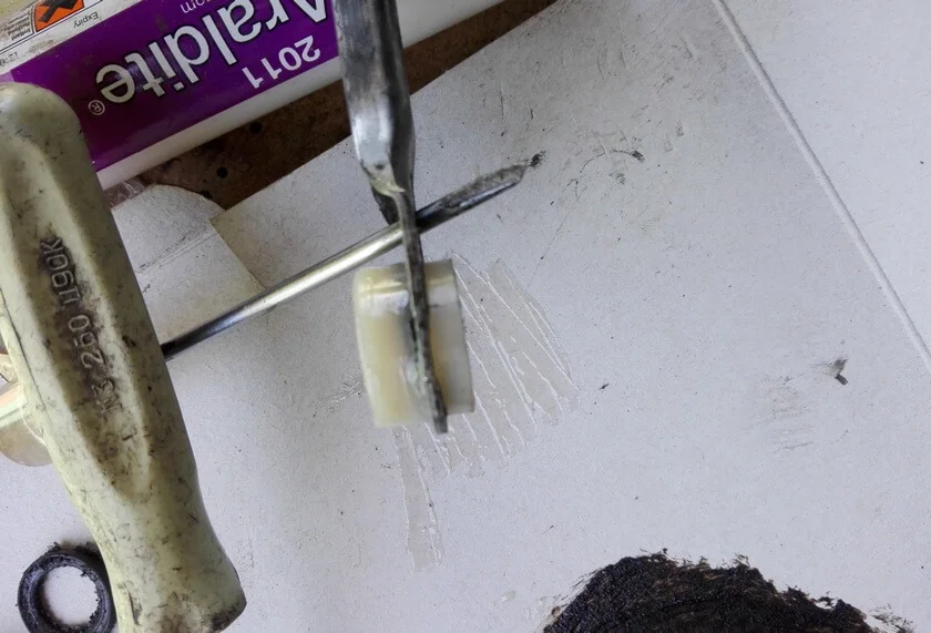 Обследовав состояние трапеции, я решил заменить только одну втулку — старую срезаем, новую втулку устанавливаем, со стороны кольца наматываем простую нитку 6-10 оборотов, капаем на нитку клея «секунда», в четырёх разных точках, и быстро устанавливаем стопорное кольцо. Перед установкой надо приготовить всё необходимое рядом, вместо «быстрого клея» подойдёт любой водостойкий клей, я же воспользовался эпоксидной композицией.