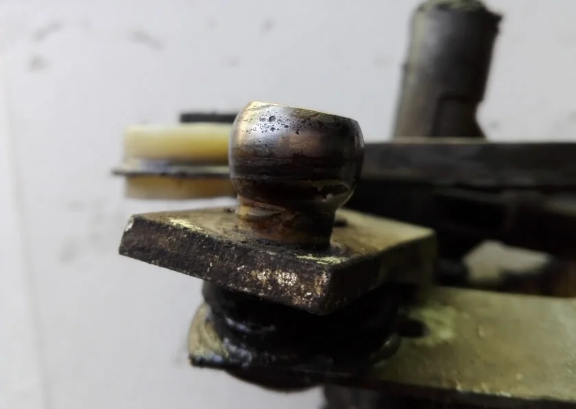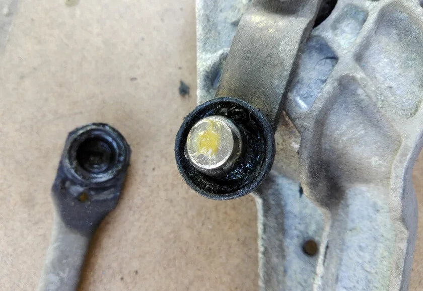 На шаре виден след по ржавчине, что шарнир охватывал поверхность косо. Сборку сделал со смазыванием движущихся частей графиткой. Угол тяги немного подправил, чтоб втулка, по оси прикладывания сил, совпала с шариком наконечника.