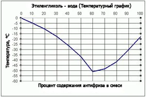 Как видно на графике, кривая кристаллизации идет вниз до уровня, когда количество этиленгликоля составит 67%, а воды — 33%. До этого момента раствор представляет собой кристаллы льда и этиленгликоль. В нижней точке замерзают обе жидкости.