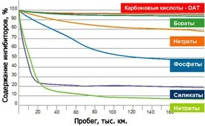 Содержание ингибиторов в зависимости от пробега