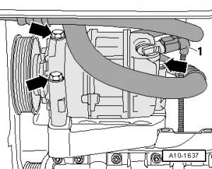 - Отсоединить провода регулировочного клапана компрессора кондиционера -N280- в штекерном разъеме 1;