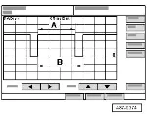- На экране осциллографа в зависимости от настройки модуля управления и индикации, блок управления Climatronic -J255- отобразится следующее: в режиме „OFF“ или „Econ“ („AC“ выкл.) — нет прямоугольного сигнала (регулировочный клапан не настроен). В режиме „Автом.“ („AC“ вкл.) и при настройке температуры „Lo“ (температурный переключатель в стопоре „Холод“) сигнал прямоугольной формы с длительностью импульса A от 75% до 100% (настройка регулировочного клапана);