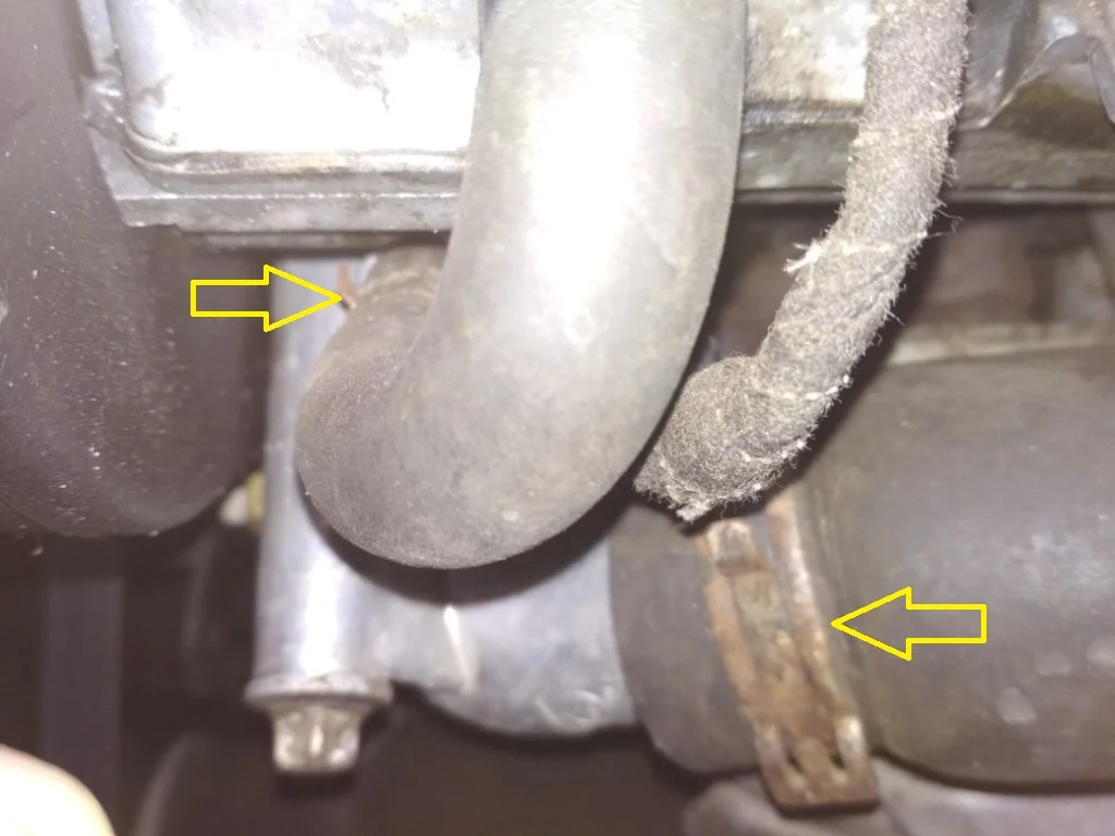 - Снимаем патрубки охлаждения, предварительно сняв пружинные хомуты. Надо быть осторожным, так как небольшое количество охлаждающей жидкости с патрубков может пролиться.