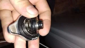 - Проверка атмосферного клапана. Для проверки его нужно потянуть и открыть. Далее отпустить и проверить, чтобы он полностью закрывался. Также в процессе проверки нужно обязательно проверить седло клапана на предмет наличия в нем грязи или отложений, которые могут появиться в процессе испарения старого антифриза. Если грязь или отложения имеются, то вариантов два. Первый — попробовать почистить седло. Второй — заменить крышку на новую. Однако все зависит от степени загрязнения внутренней поверхности вакуумного клапана.