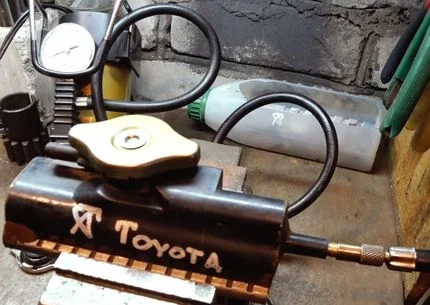 Опуская подробности изготовления прибора, можно сказать, что он представляет собой отрезанный верхний бачок радиатора, на котором заглушили все соты, чтобы через них не выходил воздух, а также боковые стенки с аналогичной целью. К одной из боковых стенок герметично присоединяется ниппель автомобильной камеры, к которой подсоединяется компрессор. Далее испытуемая крышка устанавливается на свое посадочное место, а с помощью компрессора подается давление. По показаниям манометра можно судить о ее герметичности, а также работоспособности встроенных в нее клапанов. Преимущество данного прибора — низкая себестоимость. Недостатки — трудоемкость изготовления и неуниверсальность. То есть, если крышка отличается диаметром или резьбой, то для нее нужно изготавливать аналогичный прибор, однако уже из другого негодного радиатора.