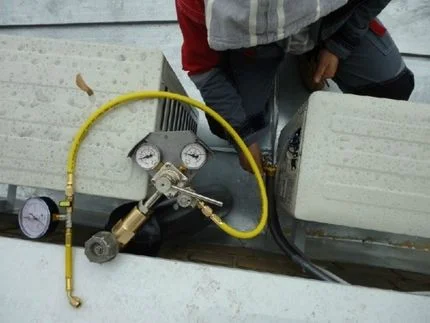 В процессе измерения важно знать, что при нормальной работе кондиционера давление в магистрали всасывания (низкого давления) должно быть в районе 2 бар, а в магистрали нагнетания (высокого давления) — 9...12 бар. Если давление меньше, значит, необходимо проверить работу компрессора.