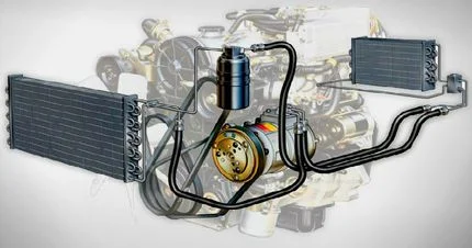 - Конденсор. Этот узел обеспечивает охлаждение фреона. При его частичном выходе из строя или загрязнении соответствующее охлаждение будет выполняться с низкой эффективностью. При этом обычно происходит перегрев и повышение давления в системе кондиционирования.