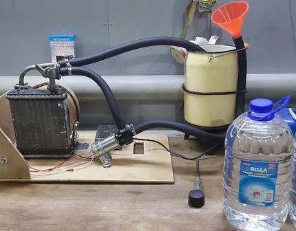 Для изготовления приспособления вам понадобится: автомобильная помпа с электрическим приводом, три шланга, которые по диаметру соответствуют выводам радиатора и помпы, зарядное устройство аккумулятора, погружной кипятильник (которым нужно подогревать жидкость), емкость для раствора, фильтрующий элемент (синтетический носок или чулок), чистящий состав, подставку под емкость с раствором на уровне помпы.