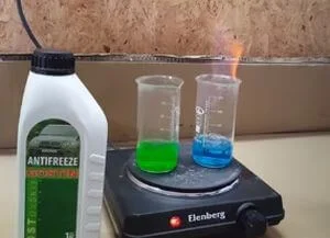 Эксперимент делается просто. Достаточно при проверке температуры кипения пытаться поджечь испаряющиеся из колбы пары антифриза когда он кипит. Для этого лучше использовать сосуд с узким горлышком. Если они горят — антифриз некачественный, если же не горят — то данный тест он выдержал, а значит возгорание и разрыв патрубков не грозит.