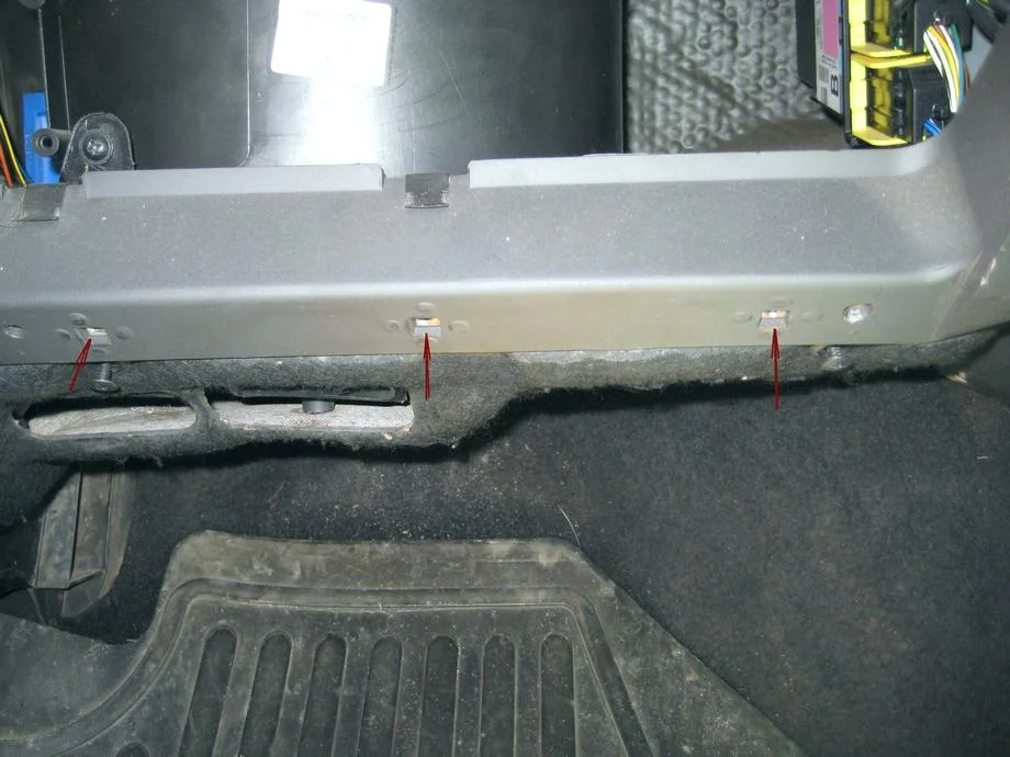 Откручиваем с поддеванием сердцевину (крест) пластиковых пистон, вынимаем сами пистоны, три штуки, снимаем нижнюю панель доступа к моторчику.