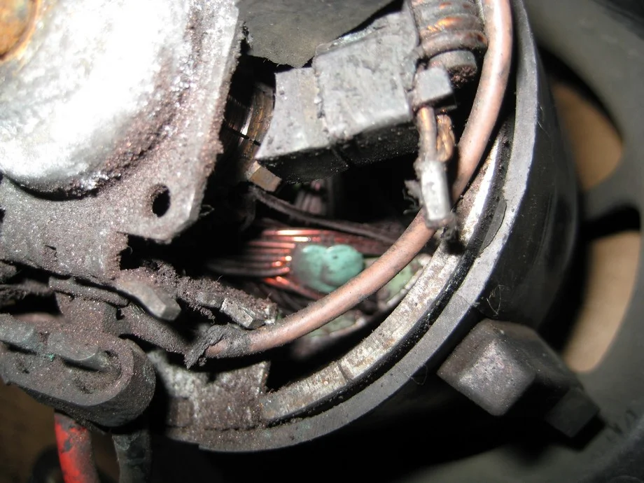Как видим коллектор стёрт и щетки уже на исходе, к следующему вскрытию надо подготовиться и хотя бы заменить щётки, размер 5*5 мм. Как показало обследование материал щёток ближе к меди а не графиту наверное графит в системе вентиляции не уместен по экологическим соображениям. Поэтому и подбор замены следует делать из более медных щёток, лишний размер всегда можно сточить перед установкой.