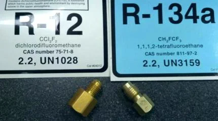 Ранее для заправки кондиционера использовали фторсодержащий фреон R-12, хоть он и более продуктивный, но из-за того, что очень вредный, в 1992 г. его применение запретили, и заменили на хладагент R-134а. Поэтому владельцам автомобилей с кондиционером выпускавшимся до 1992 года выпуска, приходится либо самостоятельно заправлять, либо переходить тоже на новый вид фреона. Ведь хотя они и работают на R-12, но на сервисных станциях заправка хлорфторосодержащего газа запрещена. Так что все новые модели машин с автомобильным кондиционером заправлены фреоном R-134а. Кстати, какой фреон в автомобильном кондиционере конкретной системы, можно увидеть на табличке, подняв капот. Хотя перепутать сложно, ведь даже заправочные штуцеры разные (в трубке под R-134а он выше и с большим диаметром). На наклейке под капотом также можно увидеть и норму заправки фреона в автокондиционере.