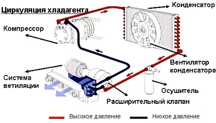 Системы кондиционирования имеют две стороны: низкого (показана красной стрелкой) и высокого давления (на нее указывает синяя стрелка).