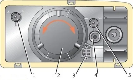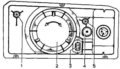 Схема фар ВАЗ 2107: 1 – винт горизонтальной регулировки, 2 – крышка лампы, 3 – разъем питания, 4 – установочный винт-заглушка или гидрокорректор, 5 – винт вертикальной регулировки